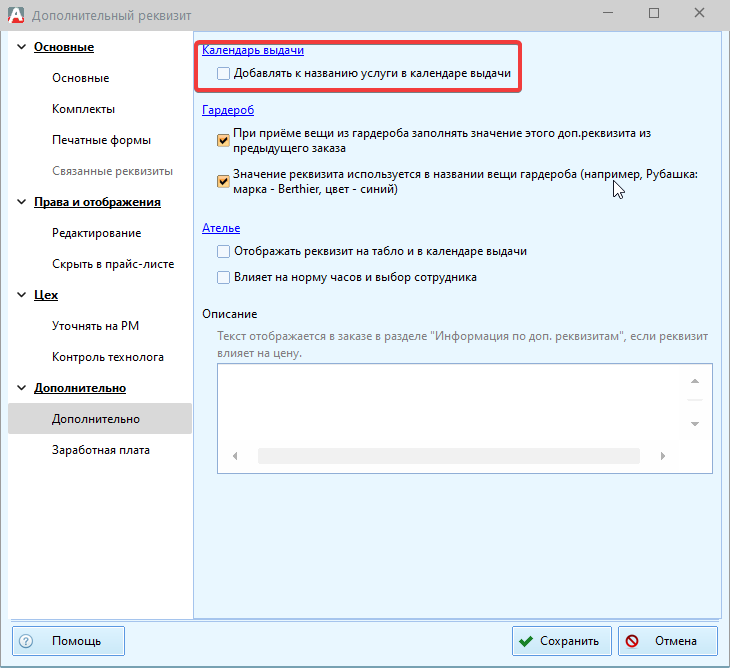Для этого необходимо открыть карточку нужного дополнительного реквизита в Агбис Химчистка (Справочники - Номенклатура - Дополнительные реквизиты), перейти на вкладку "Дополнительно" и поставить галочку "Добавлять к названию услуги в календаре выдачи"