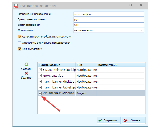 После сохранения формы комплекта настроек и перезапуска приложения Агбис Клиент файлы, не помеченные галочками, проигрываться не будут. Они будут удалены из папки приложения на планшете (по умолчанию TabletApp):