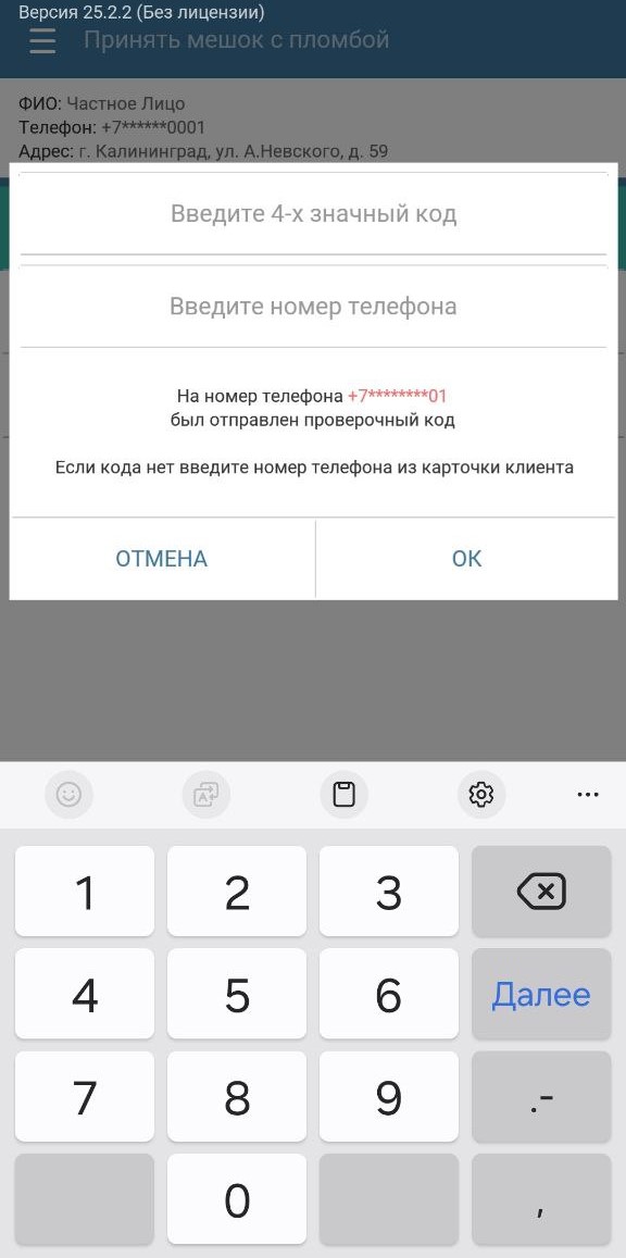 В этом режиме после оформления мешка и нажатия кнопки "Отправить код подтверждения и сохранить" клиенту отправляется смс с кодом подтверждения ссылкой на квитанцию, а в приложении открывается модальное окно для ввода кода: