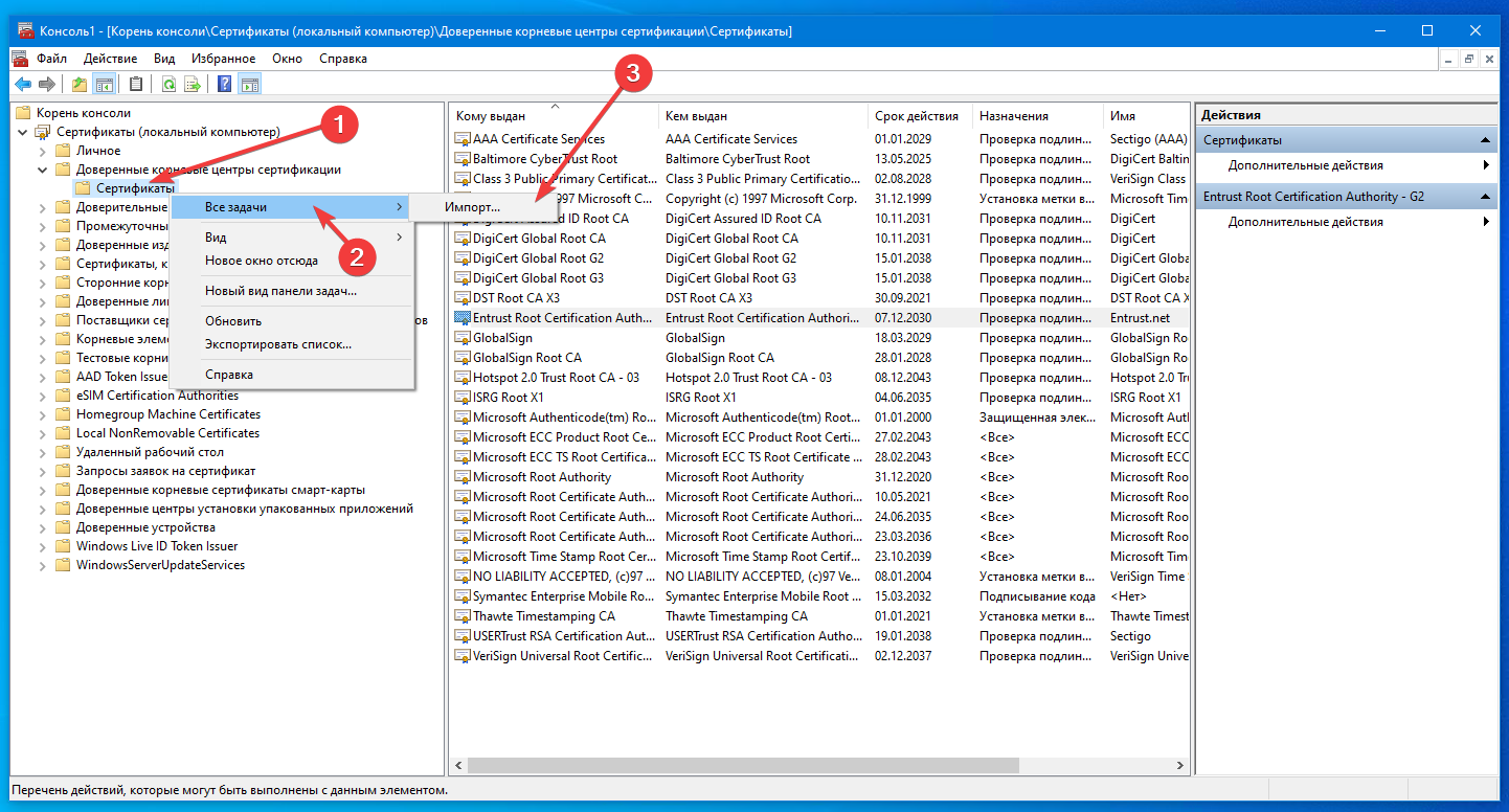 4) После того как в консоль добавится наша оснастка начинаем импортировать скаченный ранее сертификат:
