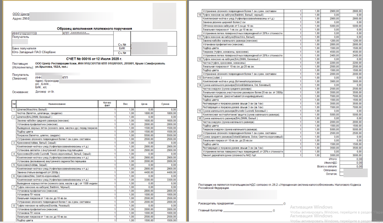 Счет по прачечным заказам с зависимыми услугами(194651)