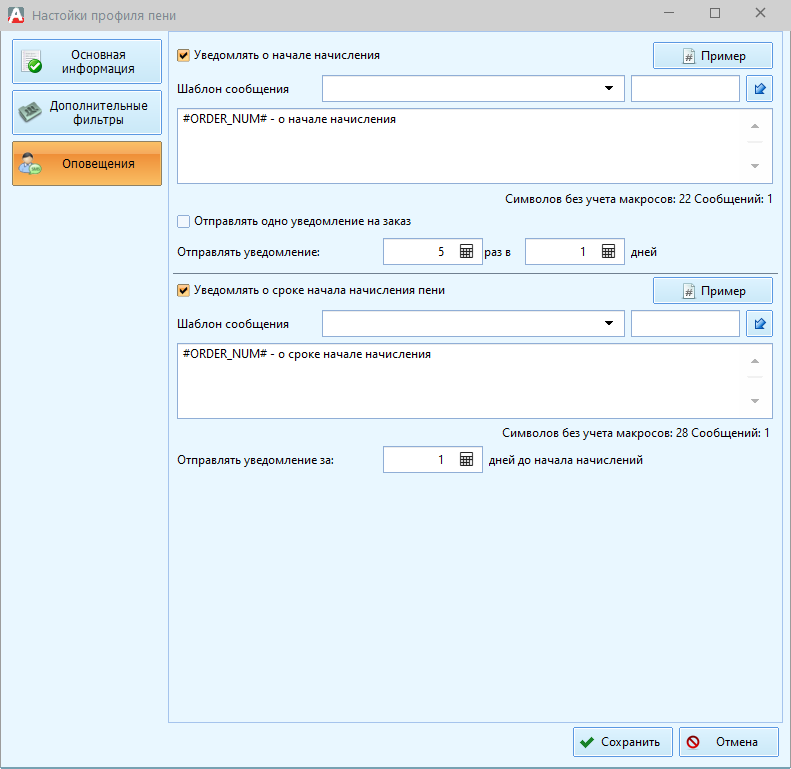 Галочка «Уведомлять о начале начисления» — включает или отключает отправку сообщений в момент, когда пеня уже начала начисляться.