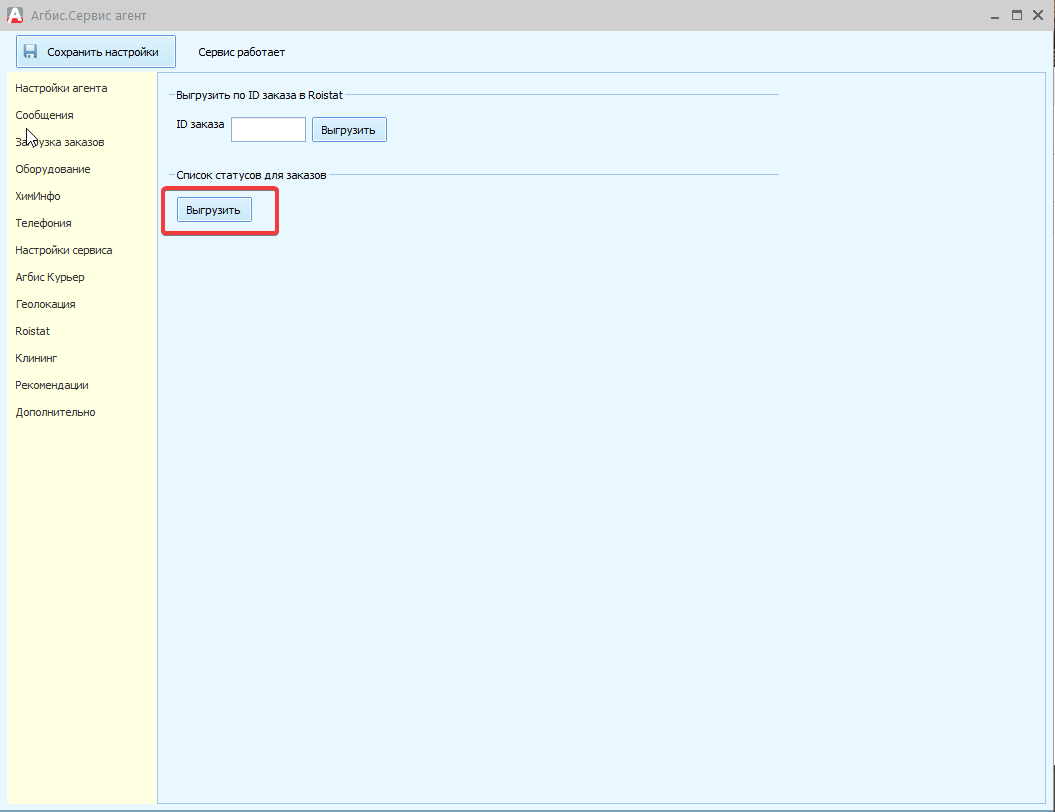 Далее, необходимо выгрузить в Ройстат статусы заказов. Для этого необходимо открыть AgentGUI на сервере, перейти на вкладку Roistat и нажать кнопку Выгрузить: